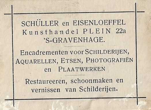 In die jaren heeft Jan overleg met Nico van Harpen, directeur van De Larensche Kunsthandel, in 1905 in Laren en in 1907 ook in Amsterdam, over nauwere samenwerking.29 Het is niet duidelijk in welke mate die daadwerkelijk tot stand is gekomen. In begin 1913 gaat Jan samenwerken met J.N.H. (Nico) Eisenlöffel (1881-1974) die in Amsterdam werkt bij de fa. Wed. G. Dorens & Zoon, fabrikant van exclusieve meubelen op Rokin 56.30 De zaak in Den Haag krijgt dan de naam Schüller en Eissenlöffel. Er worden onder die naam tentoonstellingen georganiseerd van werk van Leo Gestel, Louis Raemaekers, Etha Fles en Willem Paerels.31 In de tweede helft van dat jaar krijgt ook de zaak aan het Rokin in Amsterdam die naam. Is deze fusie ingegeven door de moeilijke omstandigheden in aanloop naar de Eerste Wereldoorlog en de behoefte de zaak een steviger financiële basis te geven? Of zijn het zorgen over zijn gezondheid die Jan deze stap doen nemen? De samenwerking is slechts van korte duur; in oktober 1914 wordt hij weer ontbonden. De reden daarvan is niet bekend.