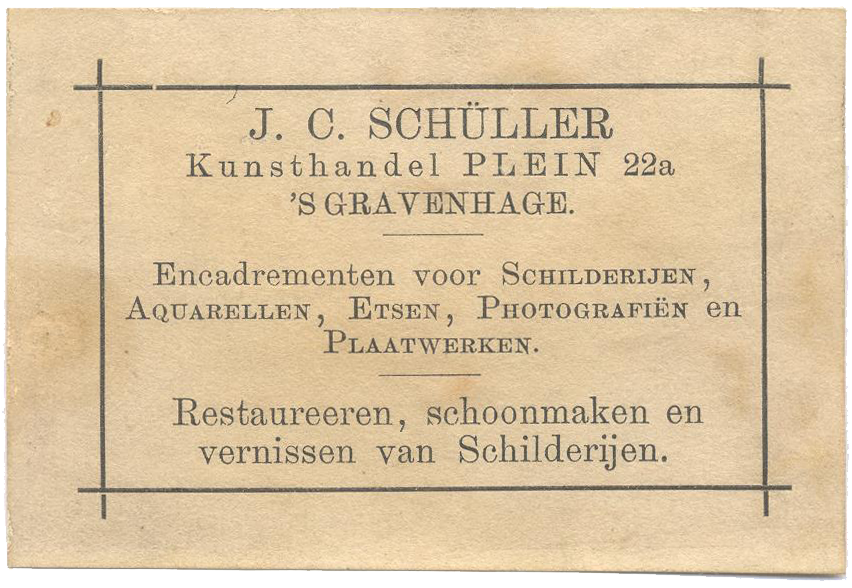 Het jaar daarop, in 1903, begint Jan een eigen kunsthandel (‘Kunsthandel J.C. Schüller’) annex lijstenmakerij11, op Plein 22A, in een winkelpand naast het Ministerie van Buitenlandse Zaken12. Er bestaat een foto van het interieur van de kunsthandel13, welke schilderijen daarop staan afgebeeld is nog onderwerp van onderzoek. Zoon Therus herinnerde zich dat er aan de achterzijde van het pand een lijstenmakerij was. Behalve kunsthandel is het pand aan het Plein ook een kunstzaal; Jan organiseert er regelmatig tentoonstellingen (zie bijlage 1), ook van kunstenaars die minder gevestigd waren dan die van de Haagse School. Zijn belangrijkste protegé zou uiteindelijk Jan Mankes blijken te zijn.14