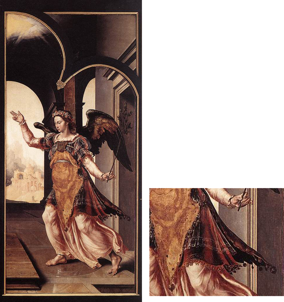 Een engel met een engelachtig meisjesgezicht en stevige armen en benen die de ruimte binnen komt gezeild. Zoals zo vaak bij Van Heemskerck fascineert de wonderbaarlijk mooi weergegeven kleding van de figuur. Verschillende stoffen over elkaar heen: roze satijn, donkerrode zijde met ingeweven strepen en gouden franje en daar weer overheen gedrapeerd een kledingstuk van doorzichtige stof. Maar wat vooral opvalt is het voorschoot dat de engel draagt: een lap leer. Is dat een verwijzing naar de drapeniers die dit altaarstuk ooit bestelden, voor hun altaar in de St. Bavokerk? Drapeniers hielden zich bezig met de fabricage van laken, wollen stof, een van Haarlems meest succesvolle producten. Die wol kwam weer van schapen of lammeren en nadat de wol was geschoren bleef de huid over die tot leer kon worden gelooid. Is dat Gabriels voorschoot? Aan het voorschoot hangen belletjes en onderaan een bel met een klepel van een, lijkt het, een rode edelsteen, granaat? Helemaal rechts aan de rode zijde hangt nog een belletje, en wie weet, zijn er, onzichtbaar, nog meer. De engel komt binnen met belgerinkel. Is het heel ver gedacht om daarin een verwijzing te zien naar de belletjes die volgens de bijbel aan het kleed van de hogepriester van de tempel waren bevestigd, om de dood te verdrijven? Belletjes die ook hun weg hebben gevonden naar rammelaars die met hun geluid kleine kinderen moesten beschermen tegen het kwaad?